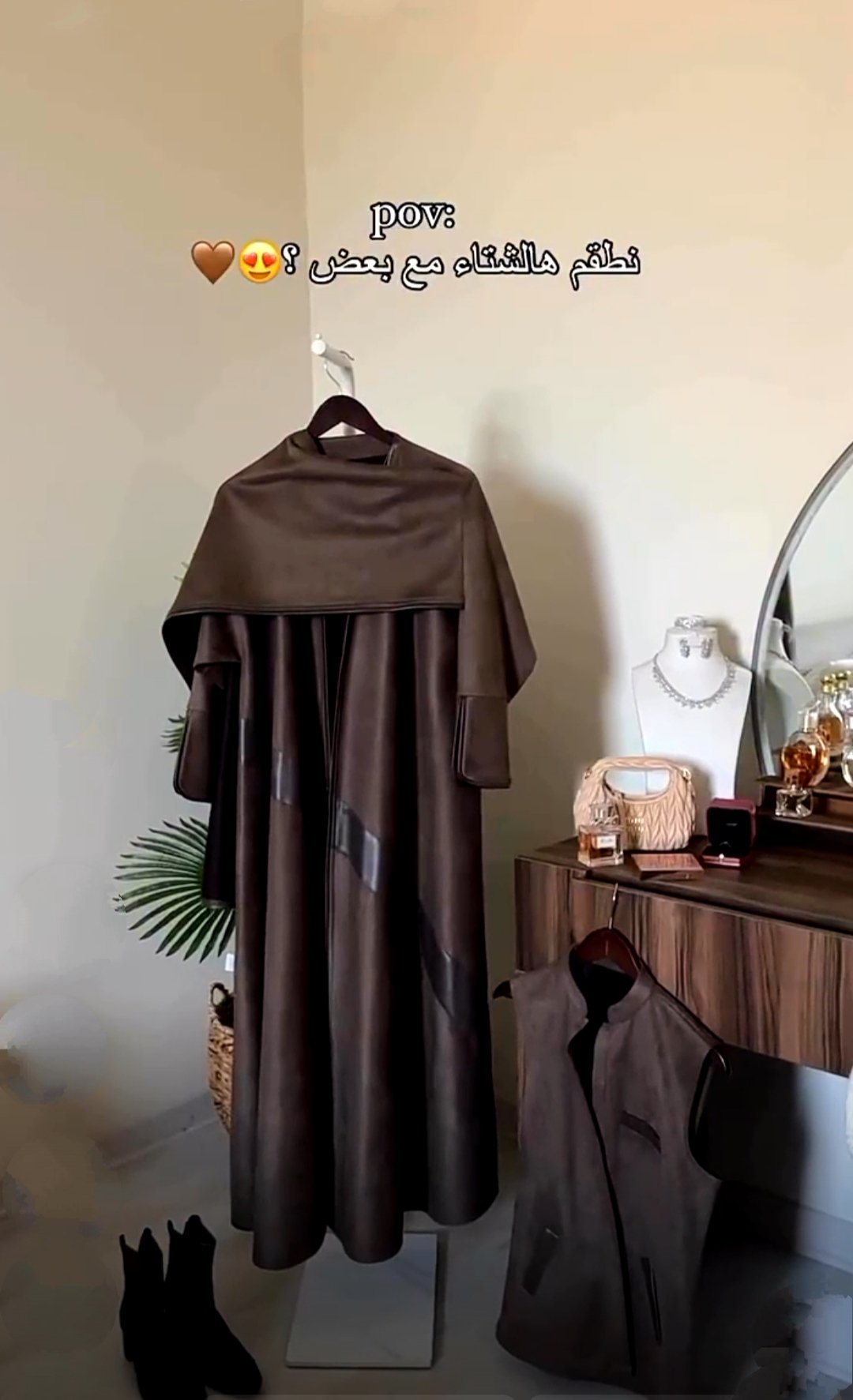 عبايه قماش جوخ نص كلوش بني اطراف جلد"